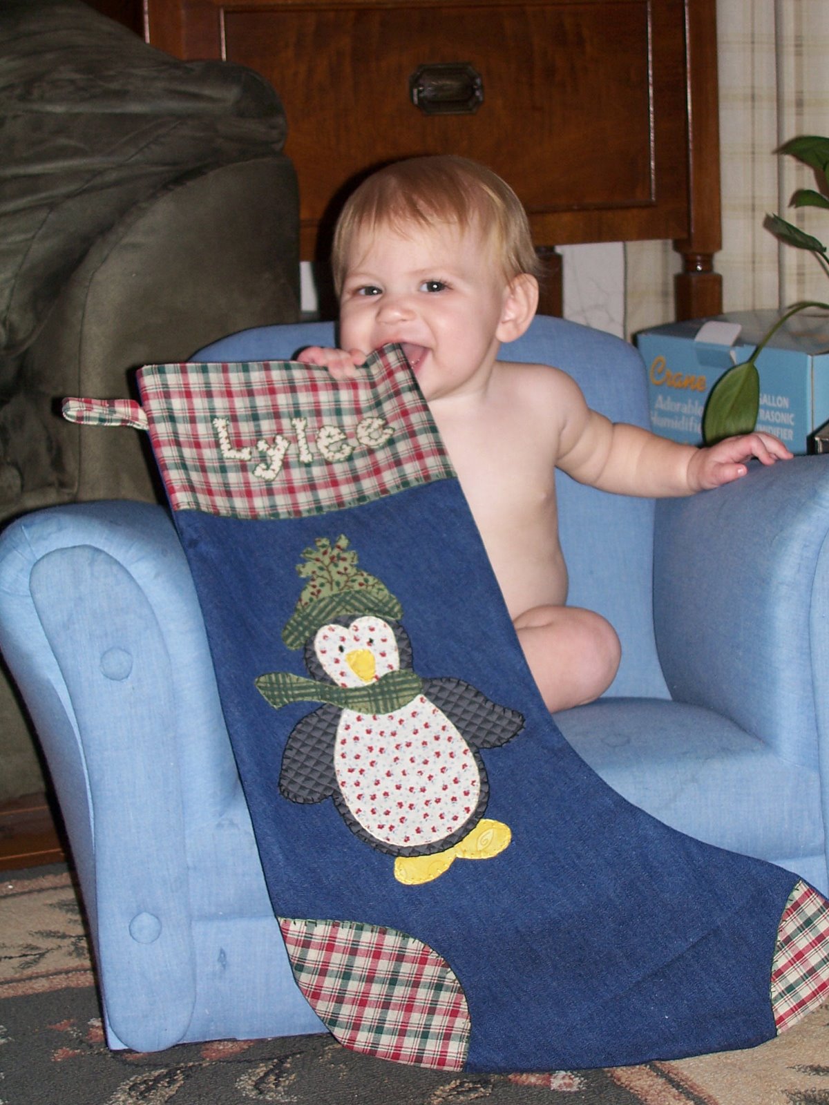 We all have stockings that I made. Everyone's is supposed to reflect a part of their personality. I don't think that I ever took one of Taylor with his before. I made Chris and my stockings the second Christmas that we were married. This is one of my favorite traditions in our family. It's always so fun for everyone to see what's inside on Christmas morning!!